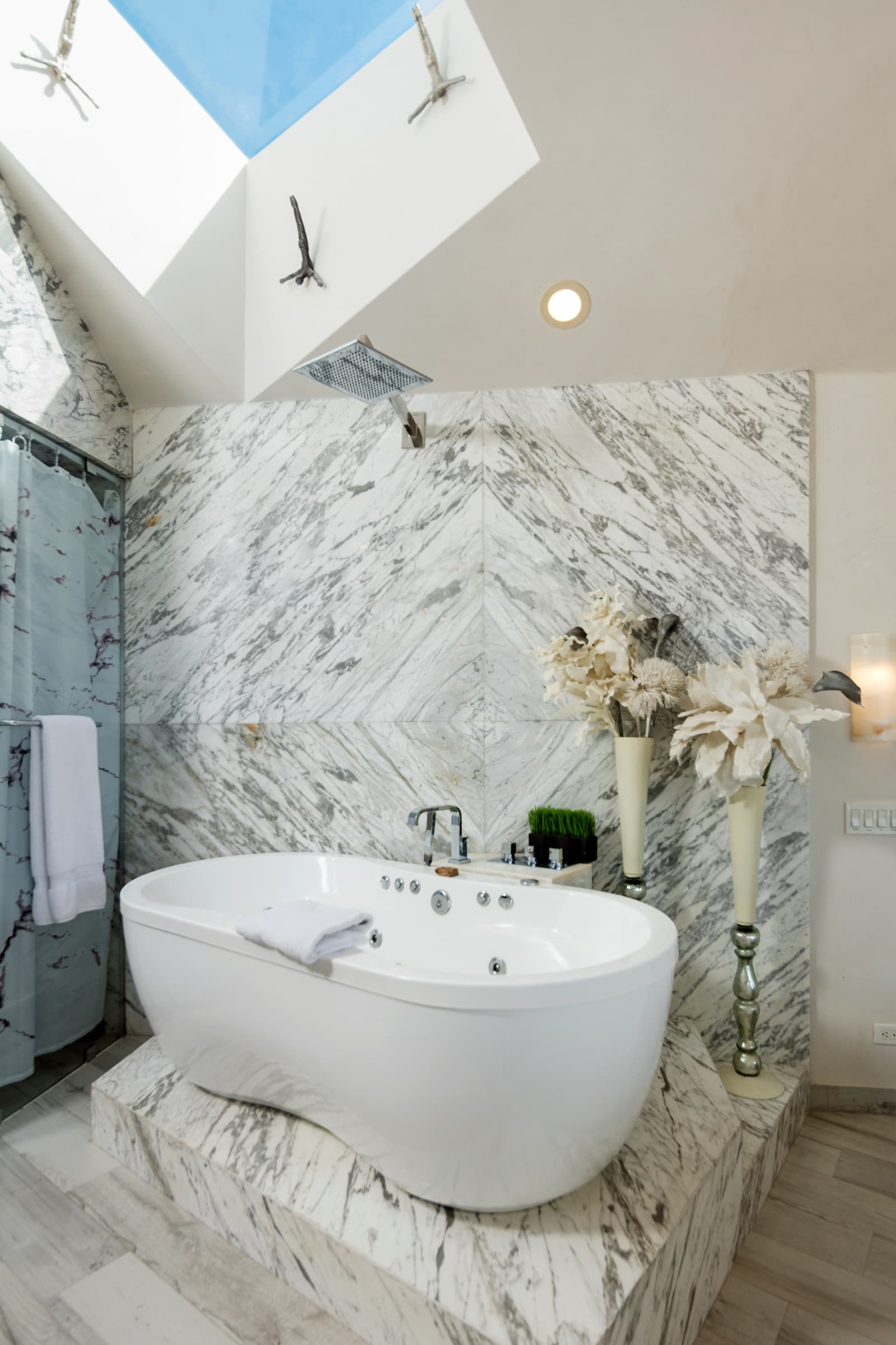 - The bathtub is modern and stylish and features a rain shower head and bathtub with hydromassage jets.