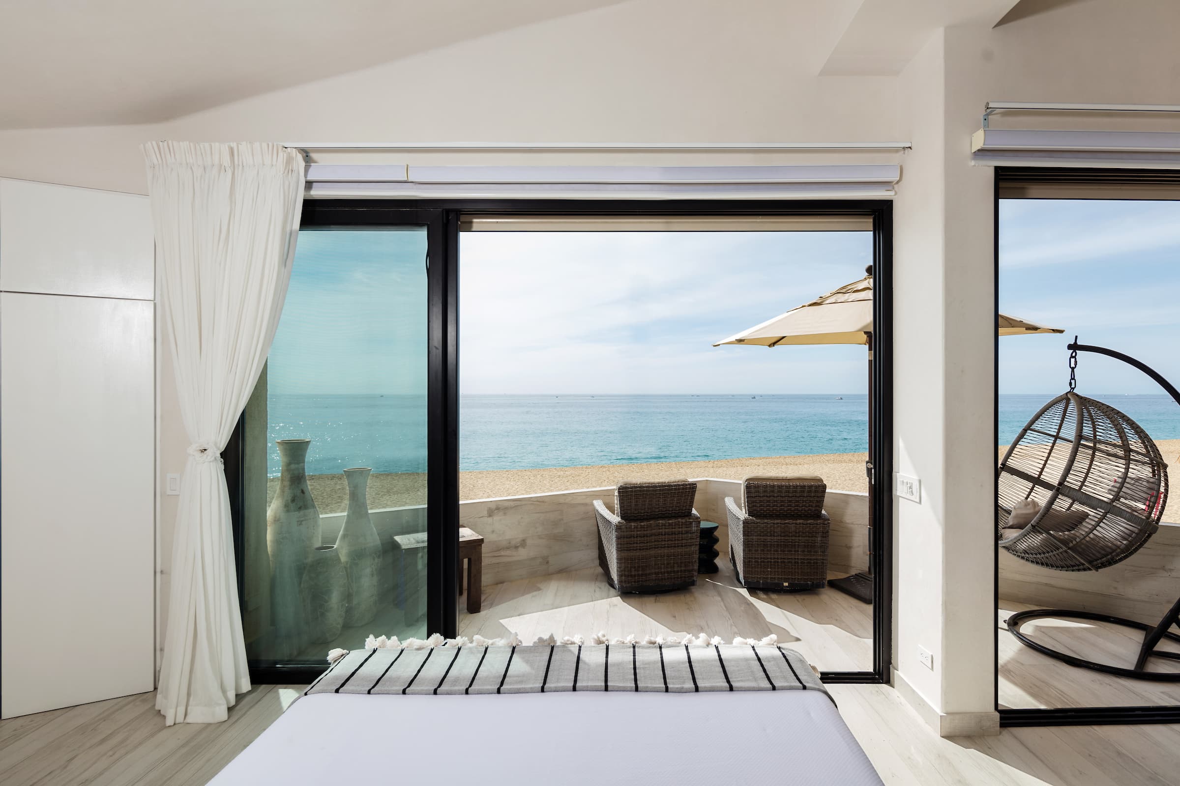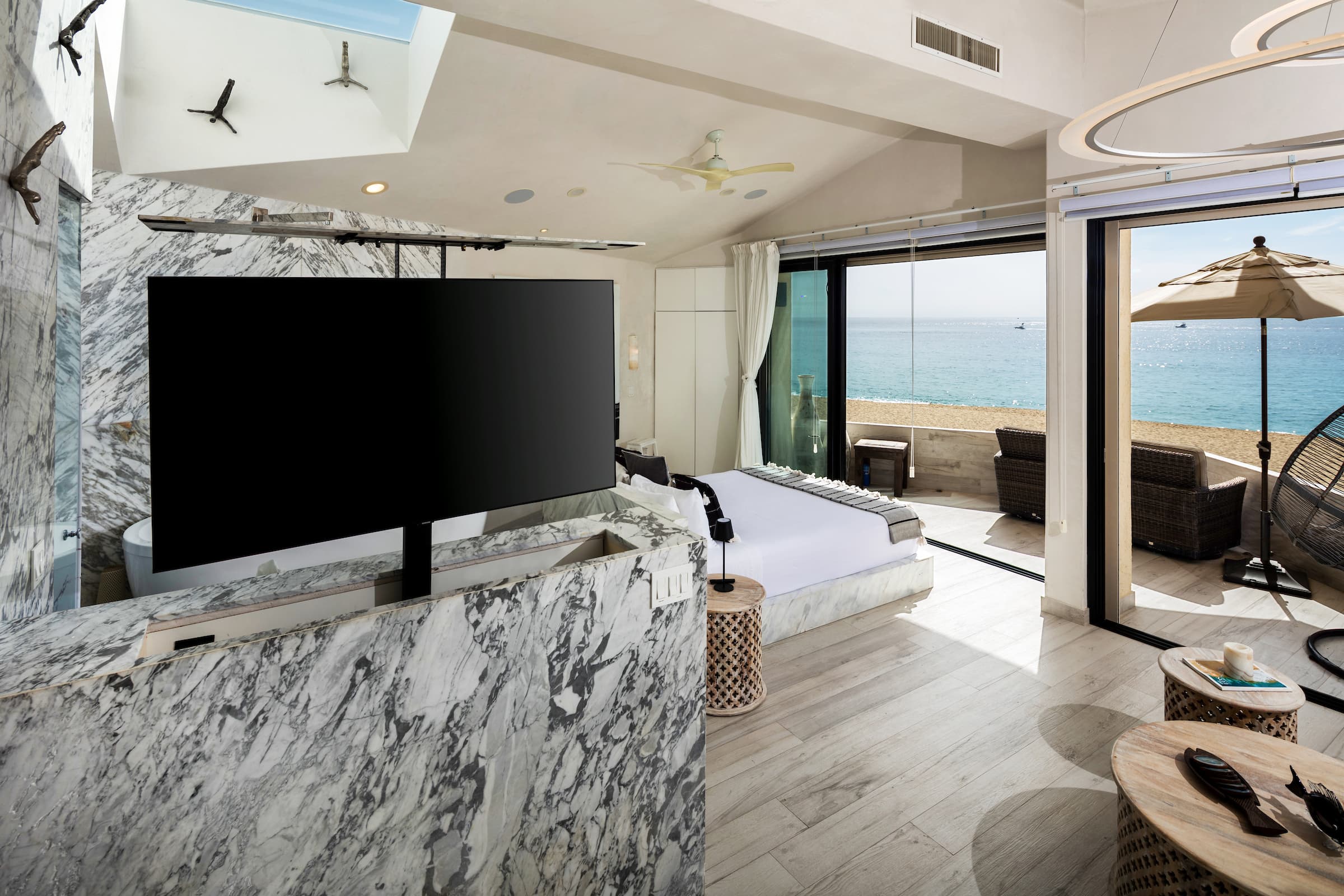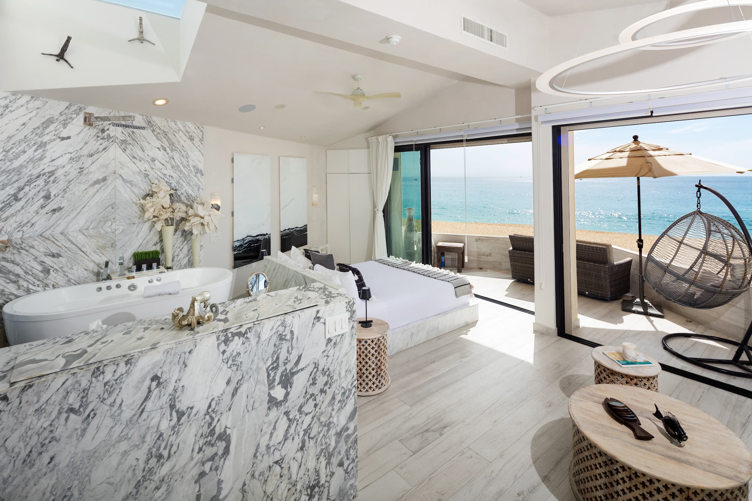 - King size bed on marble frame, facing the huge sliding glass doors, that gives direct access to the private balcony that features a fire pit and a rattan swing.
