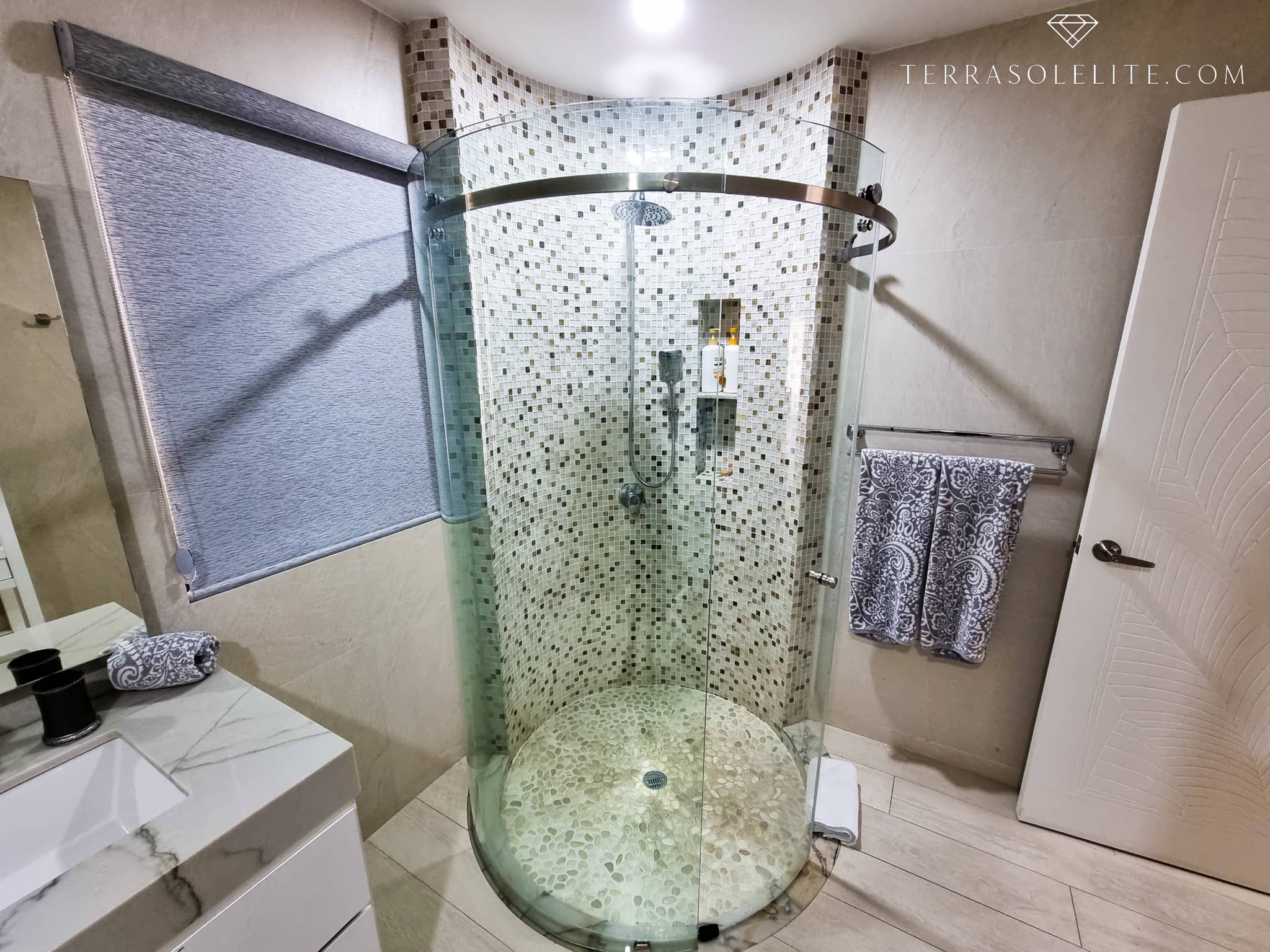 - Enclosed shower/toilet room with a beautiful glass door shower and an amazing view of the Marina.